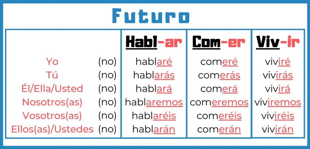 Note: If we use the infinitive instead of the stem, all verb conjugations (-ar, -er, and -ir) have the same endings in the simple future tense: -é, -ás, -á, -emos, -éis, -án. – Si consideramos el infinitivo en vez de la raíz, todas las conjugaciones (-ar, -er, and -ir) tienen las mismas terminaciones: -é, -ás, -á, -emos, -éis, -án.