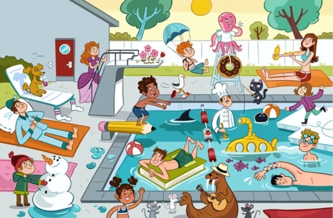 - Piscina loca: Describe lo que está haciendo cada personaje.